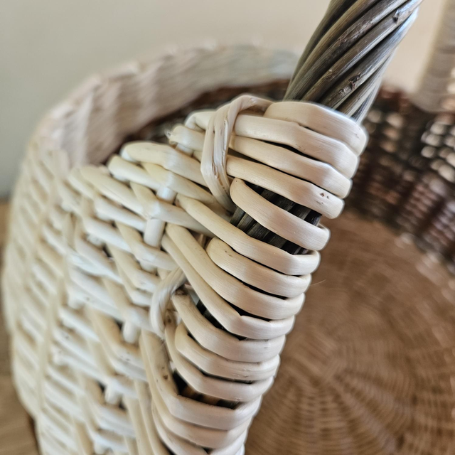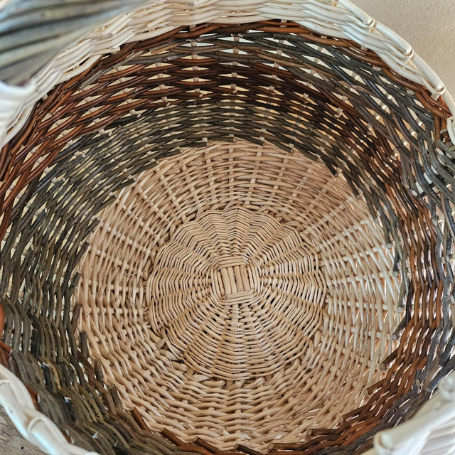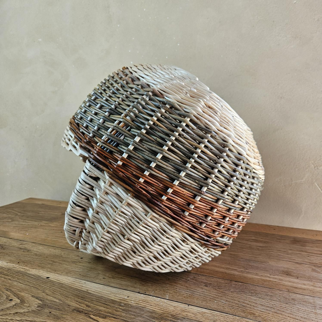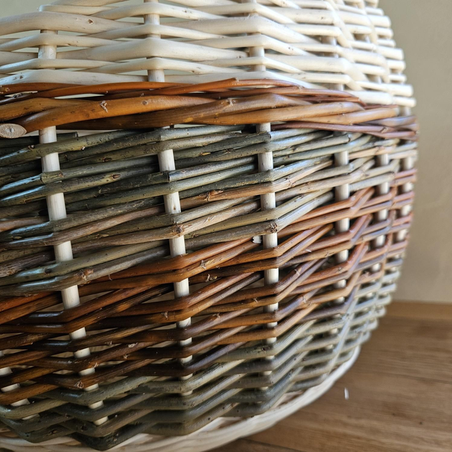 Panier-boule en osier brut et blanc, mêlant plusieurs teintes naturelles d’osier, dans des nuances vertes et orangées.